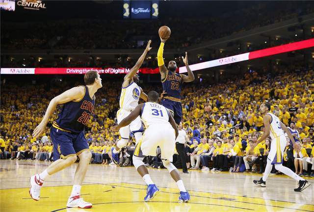 14-15赛季总决赛,詹姆斯所在的球队骑士,第2场在客场拿到一场胜利,第3场回到主场又是险胜,大比分2-1领先。